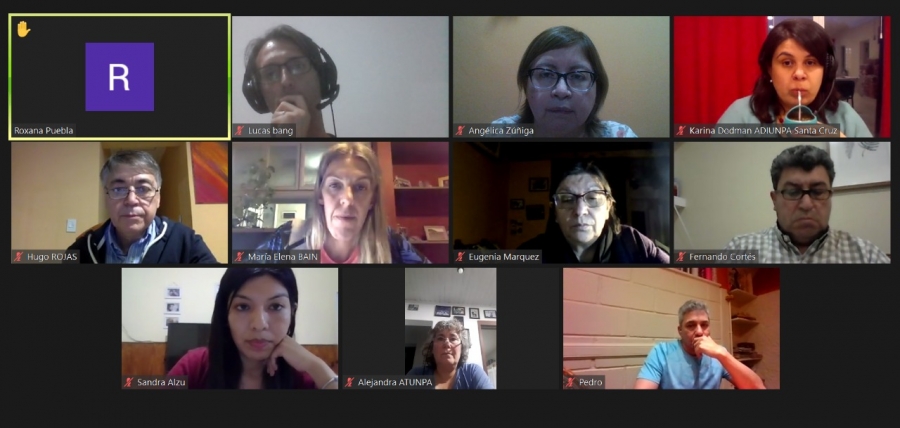 El encuentro se desarrolló de forma virtual y participaron el rector de la UNPA Ing. Hugo Rojas, la vice rectora Prof. Roxana Puebla y la Secretaria General Académica Dra. María Elena Bain, la secretaria de Legal y Técnica Eugenia Márquez, y representantes de ADIUNPA, en tanto que por la comisión directiva de ATUNPA participaron Pedro Pacheco, Alejandra Paice, Angélica Zúñiga y Fernando Cortes.