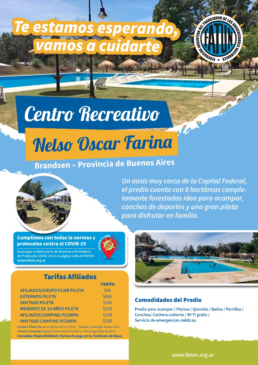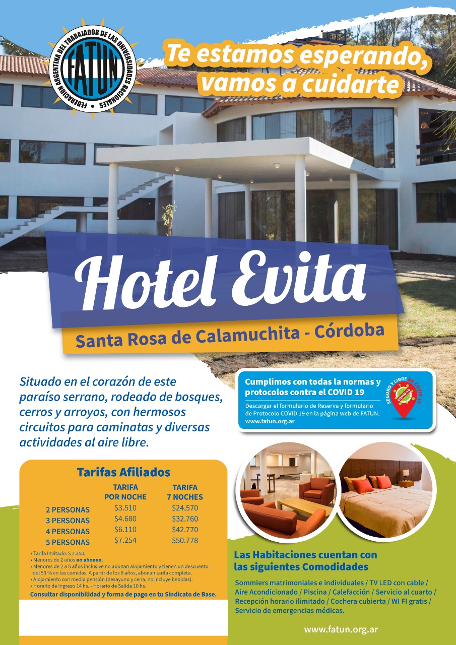 Compañeros/as les compartimos los afiches con las tarifas correspondientes para la temporada de turismo 2020-2021. Los hoteles son: Apart Hotel "26 de Noviembre" - Mar de Ajo; Apart Hotel "17 de Octubre" - Villa Giardino; Hotel Evita - Santa Rosa de Calamuchita, y el Centro Recreativo "Nelso Oscar Farina" - Brandsen.