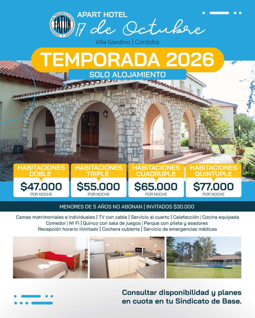 El ingreso de las personas afiliadas a los hoteles de FATUN será, sin excepción, con la autorización de la reserva enviada por la Secretaría de Turismo a cada sindicato de base. Horario de ingreso: 14 h / salida: 10 h.